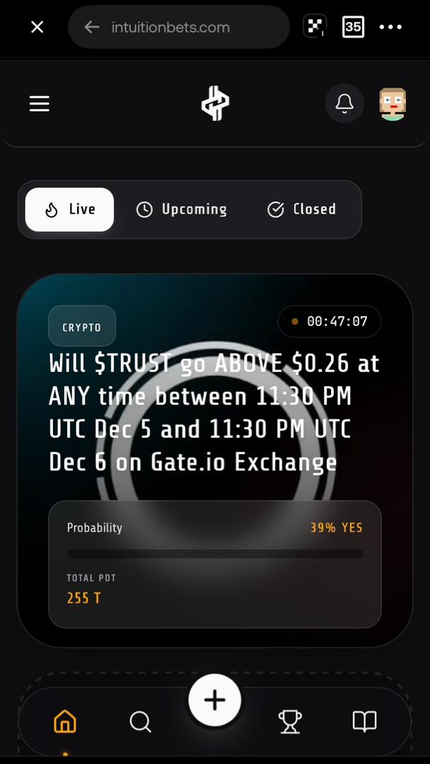 Intuition Bets is a decentralized prediction platform built on Intuition Network, where users stake the $TRUST Token(native currency of the Intuition Mainnet)on YES/NO outcomes. The platform focuses on simplicity, transparency, and wallet-only access. No need for KYC or personal data.